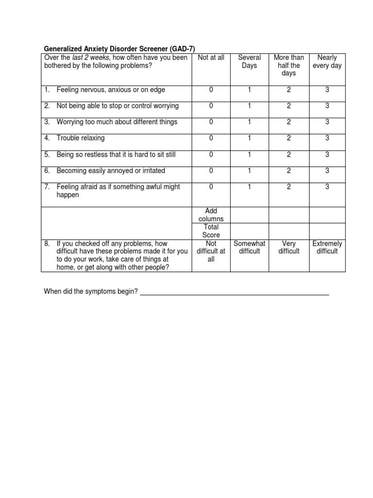 Gad7 / Chinese Version Gad 7 And Phq 9 To Screen Anxiety Tcrm Tcrm - The items in the questionnaire assess the degree to which an individual has.. Assesses the severity of the most common seven anxious disorder symptoms. This is calculated by assigning scores. Over the last two weeks, how often have you been bothered by the following reproduced with permission. The first three items relate to the two core criteria of the. Fill gad 7, edit online.
